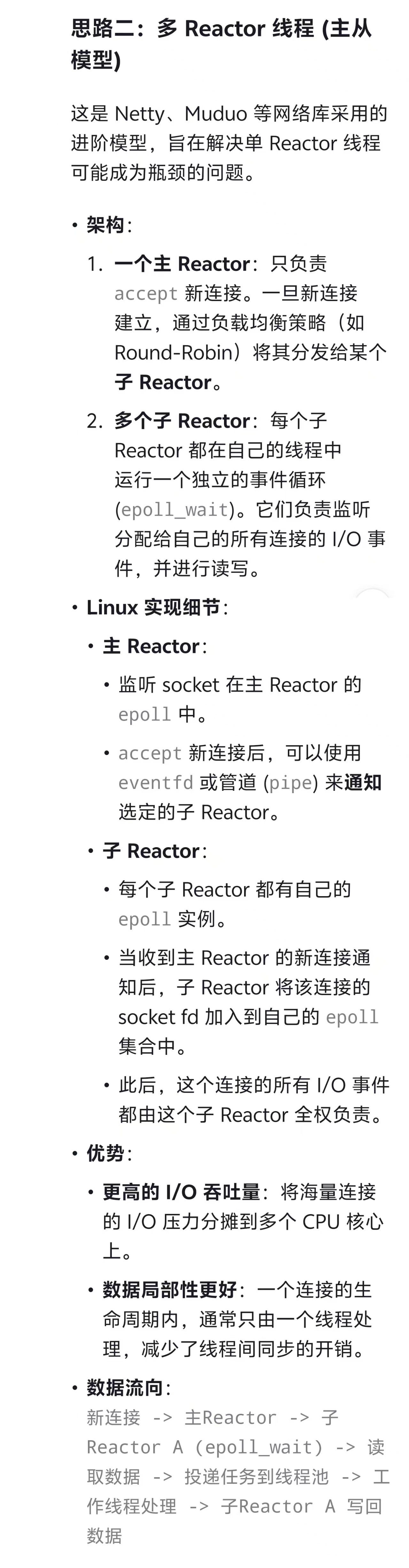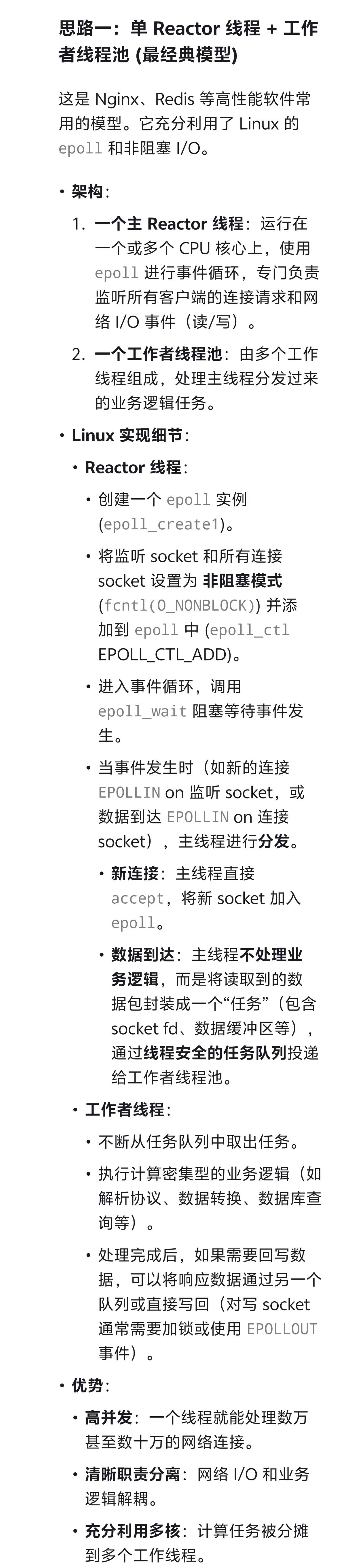 }void* worker_thread(void* arg) {while (1) {task_t* task = task_queue_pop(global_task_queue); // 阻塞等待任务process_business_logic(task); // 处理业务逻辑// 处理完成后,可能需要写回响应// write(task->fd, response, response_len); // 注意:非阻塞写,可能需要处理EAGAINclose(task->fd); // 或者将fd交还给Reactor管理free_task(task);}