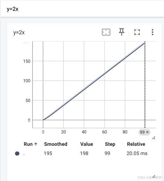 for i in range(100):writer.add_scalar("y=2x", 2*i,i) # 第一个参数:相当于标题; 第二个相当于y轴;第三个相当于x轴writer.close()