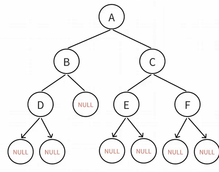 前序遍历:A->B-> D-> NULL-> NULL ->NULL-> C-> E ->NULL ->NULL ->F ->NULL-> NULL