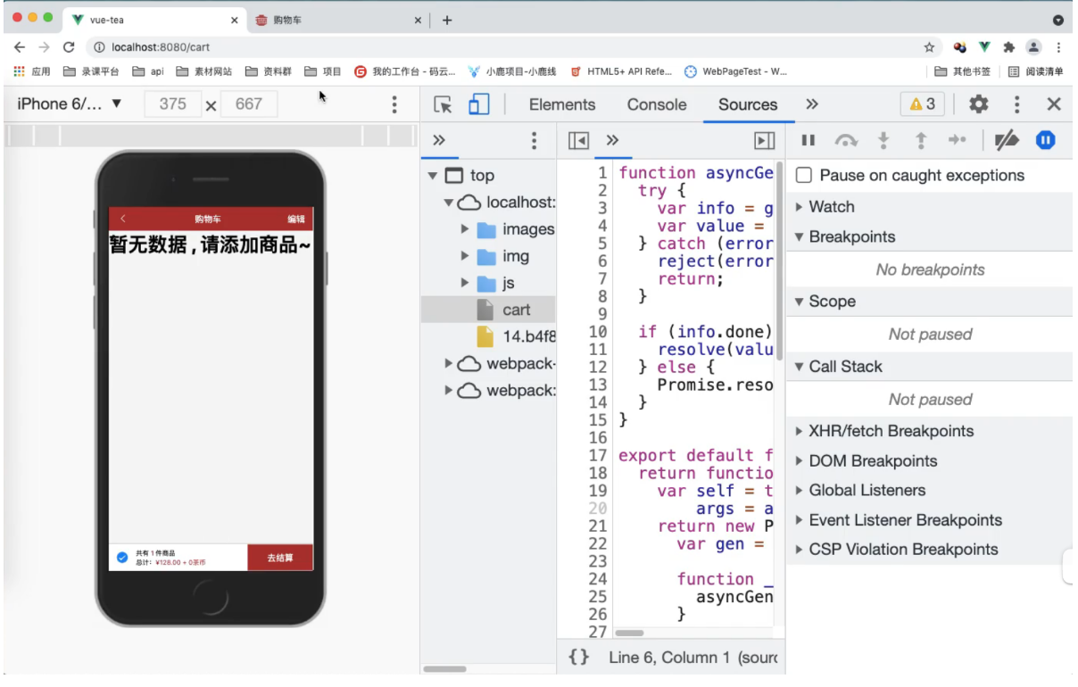 </template><script>import http from '@/common/api/request.js'import {mapState,mapMutations} from 'vuex';export default {name: "Cart",data() {return {checked: true}},// 调用 获取 list 的值computed: {...mapState({list: state => state.cart.list})},created() {// console.log(11);this.getData();},methods: {// 使用这个方法...mapMutations(['cartList']),// 前端给后端发送请求,查询某个用户async getData() {// 发送请求let res = await http.$axios({// 前端给后端查询购物车数据接口发送请求url: '/api/selectCart',method: 'POST',// 查询当前用户购物车数据,要带上 tokenheaders: {token: true}});// console.log(res.data);this.cartList(res.data);}}}
