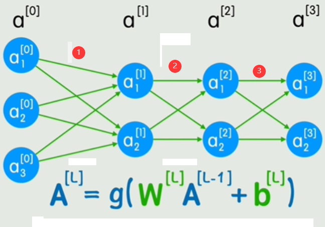 如果中间有隐藏层,即一个或多个卷积层、池化层、全连接层那么x、y就不够表示了,那就都用a来表示,第一层①则L=1,第二层②则L=2、第三层③则L=3