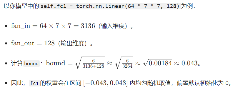 class MNISTCNN(torch.nn.Module):def __init__(self): #类的构造函数,定义对象时自动调用super(MNISTCNN, self).__init__()# 卷积层:提取局部特征(如边缘、纹理)self.conv1 = torch.nn.Conv2d(in_channels=1, # 输入通道数(灰度图为1)out_channels=32, # 卷积核数量(提取32种特征)kernel_size=3, # 3×3卷积核stride=1, # 步长1padding=1 #padding填充的意思) #边缘填充 1 圈 0 像素,保持输出尺寸与输入一致(28×28)# 池化层:降维并增强鲁棒性self.pool = torch.nn.MaxPool2d(kernel_size=2, stride=2) # 输出14×14#第二个卷积层self.conv2 = torch.nn.Conv2d(32, 64, 3, 1, 1) # 再提取64种特征,输出14×14# 全连接层:分类self.fc1 = torch.nn.Linear(64 * 7 * 7, 128) # 池化后尺寸7×7,展平为64×7×7self.fc2 = torch.nn.Linear(128, 10) # 10个类别(0-9)def forward(self, x): #前向传播函数,定义了数据在模型各层之间的流动逻辑x = self.pool(torch.relu(self.conv1(x))) # conv1→激活→池化x = self.pool(torch.relu(self.conv2(x))) # conv2→激活→池化x = x.view(-1, 64 * 7 * 7) # 展平为向量x = torch.relu(self.fc1(x)) #对展平的一维向量进行第一次全连接, 3136维映射为128维向量x = self.fc2(x) #对进行第二次全连接, 128维映射为10维向量return x#————————————————————————————————————————————————————————————————