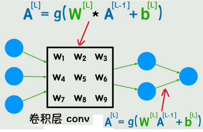 这个图在上面的基础上加入了卷积层,也就是表示了卷积层和全连接层,上面的公式是卷积层的运算,仅仅把矩阵乘法换成了卷积运算W*A