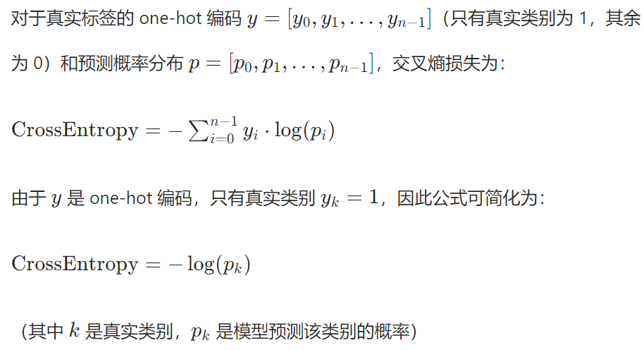 沿用上面softmax示例中的三个类别,真实标签是 “类别 0”(one-hot 为 [1,0,0]),模型预测概率是 [0.659, 0.242, 0.099],则交叉熵损失为: