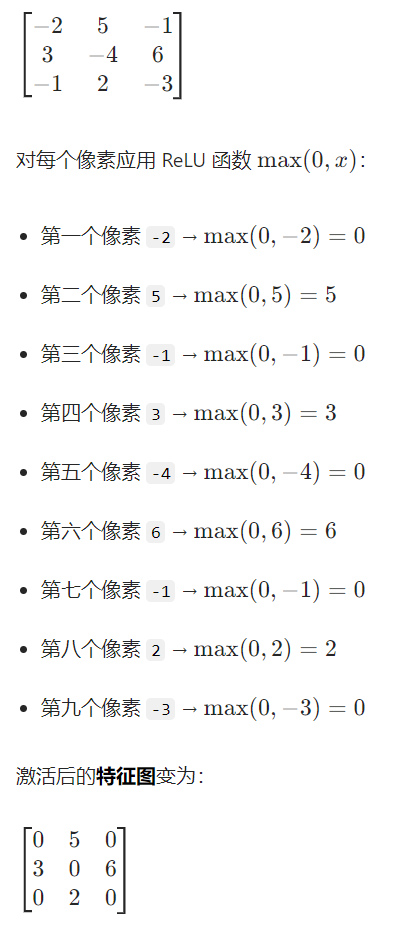 ReLU 是一个简单高效的激活函数,通过 “保留正数、抑制负数” 的操作,即ReLU 将负值置为 0,相当于 “只保留明确的正向响应,忽略模糊或反向的响应”,卷积层的 “求和” 是 “加权求和”(权重可正可负),而非简单的加法,所以会产生负数,而训练过程中会刻意让“正值” 编码表示有用特征,“负值” 编码表示无关特征