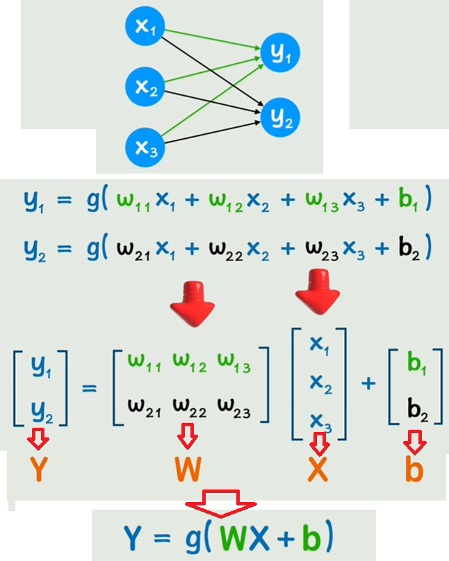 先引入CNN矩阵的来源,如下图是一个全连接层,三个x分别乘上对应的偏置w再加上一个偏置b,整体再用激活函数g激活,得到y1,y2同理;写成矩阵形式:Y=g(WX+b)