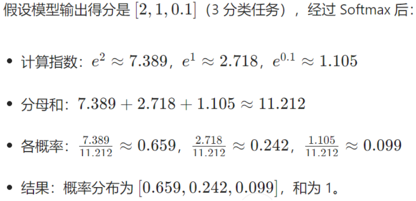 若模型预测概率是 [0.1, 0.8, 0.1](真实类别概率低),则损失为 -log(0.1) = 2.3(损失更高,说明模型预测更差)。