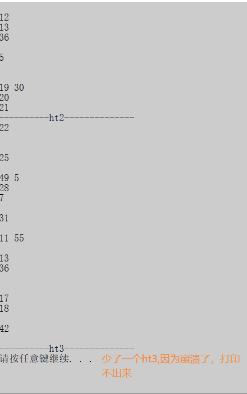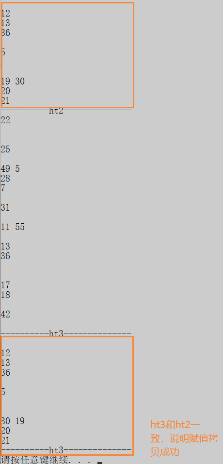 {void test4(){HashTable<int, int> ht;int a[] = { 19,30,5,36,13,20,21,12 };for (auto e : a){ht.Insert({ e,e });}HashTable<int, int> ht3;int a2[] = { 18, 25, 36, 49, 5, 13, 28, 7, 31, 17, 42, 55, 11, 22 };for (auto e : a2){ht3.Insert({ e,e });}HashTable<int, int> ht2 = ht;//拷贝构造ht2.Print(); cout << "----------ht2--------------" << endl;ht3.Print(); cout << "----------ht3--------------" << endl;ht3 = ht2;// 赋值拷贝ht3.Print(); cout << "----------ht3--------------" << endl;}