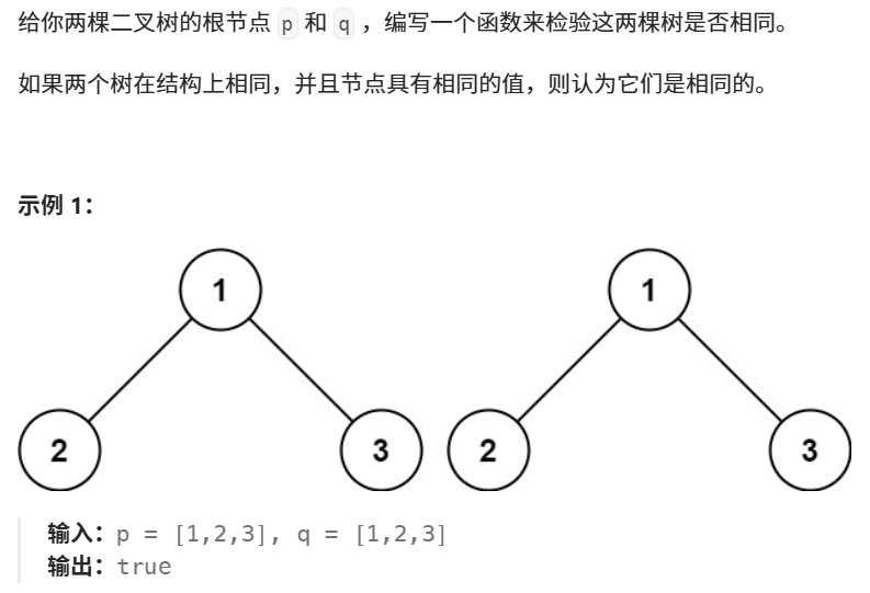 {if(p == NULL && q == NULL){return true;}if(p == NULL || q == NULL) //到这说明第一个if为假,也就说明p,q不同时为空//但如果两者有空的话说明树不同,返回false{return false;}if(p->val != q->val){return false;}return isSameTree(p->left, q->left) && isSameTree(p->right, q->right);