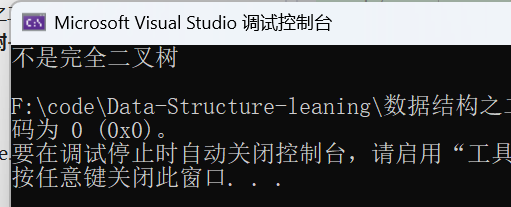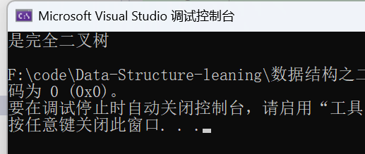 {Queue q; //创建一个队列QueueInit(&q); //队列初始化if (root){QueuePush(&q, root);}while (QueueSize(&q)) //利用层序遍历的逻辑{BTNode* rootnode = QueueFront(&q);QueuePop(&q);if (rootnode == NULL) //遇到第一个空结点则直接退出循环{break;}QueuePush(&q, rootnode->left); //孩子为空结点也需要放入队列QueuePush(&q, rootnode->right);}while (QueueSize(&q)) //此时的队列若仍有非空结点则说明不是完全二叉树,如果遍历到最后都是空结点则说明是完全二叉树{BTNode* rootnode = QueueFront(&q);QueuePop(&q);if (rootnode){return false;}}return true;