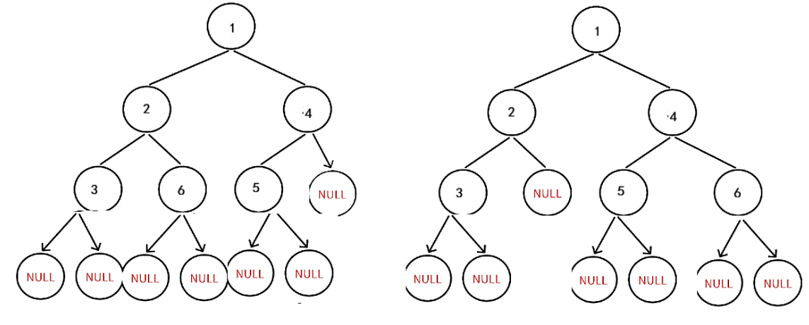 在层序遍历中当我们遇到空结点时是选择直接跳过的,只有非空结点我们才会放入队列中;但是这个问题由于我们需要从第一个空结点开始后面是否有非空判断完全二叉树,所以一个根结点如果孩子为空结点也需要放入队列中。我们以两个二叉树为例: