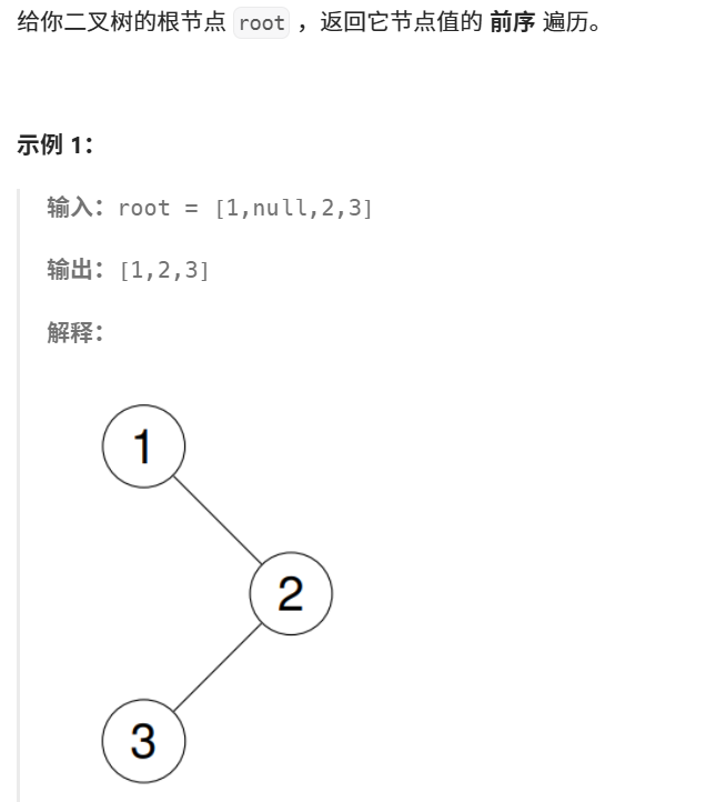 那得到数组后接下来怎么做呢?我们看到题目说是返回它节点值的前序遍历,此时我们数组为空,如果要解决问题是不是就要进行一次前序遍历,通过前序遍历将二叉树的值全部传到数组中。