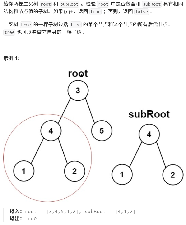 其实看到这个图大家就应该能先到会和第二题相关,当我们进行递归时如果某次root的值与subRoot相同时则需要开始进行比较两者是否相同。