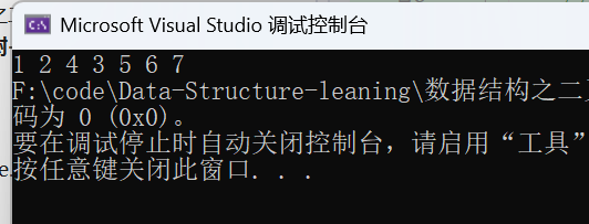 {Queue q; //创建一个队列QueueInit(&q); //队列初始化if (root){QueuePush(&q, root);}while (QueueSize(&q)) //当队列数据删完则层序遍历结束{BTNode* rootnode = QueueFront(&q); //取出队列数据QueuePop(&q);printf("%d ", rootnode->data);if (rootnode->left)//左子树为空则不需要放入队列{QueuePush(&q, rootnode->left);}if (rootnode->right)//右子树为空则不需要放入队列{QueuePush(&q, rootnode->right);}}QueueDestroy(&q);