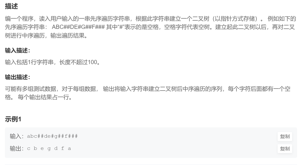 {char arr[100];scanf("%s", arr);//建立二叉树(以指针方式存储)int i = 0;BTNode* root = CreateTree(arr, &i);//地址传参就是防止递归到空结点('#')返回时形参发生改变但实参没有影响//会导致值被覆盖的情况//中序打印InOrder(root);return 0;