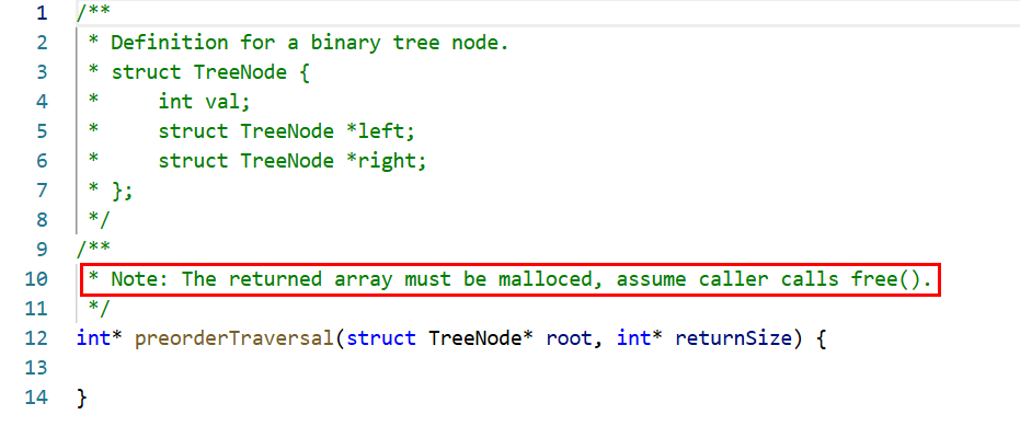 首先看到第二张图我标的红色方框意思是这道题的返回值是一个我们自己手动开辟空间的数组,也就是说我们需要将root的值传到我们自己开辟好的数组内部的。这也就是为什么函数有第二个形参returnSize,这个形参的目的就是方便我们确定开辟空间的大小。