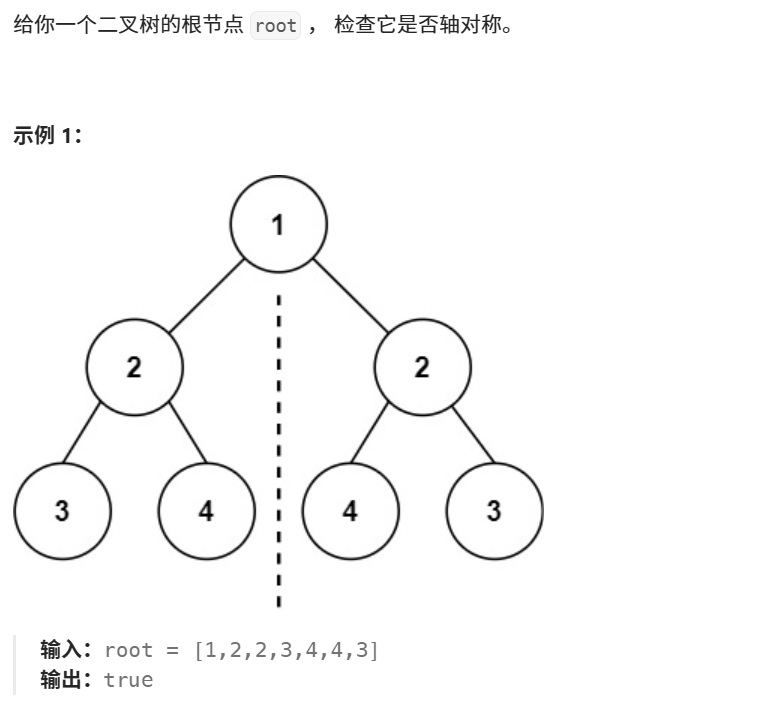 这题我们想一下怎么证明一个树是对称的,首先我们是不是要先证明根结点1的左右孩子相同,如果不相同则直接返回false;相同则开始递归,然后是不是要同时证明第二层第一个结点的左孩子和第二个结点的右孩子是否相同以及第一个结点的右孩子和第二个结点的左孩子是否相同,如果有一种情况不同就直接返回false,这样的话我们的递归就需要两个变量同时进行,所以我们还需要再自己创建一个函数;当某次递归如果其中一边不为空而另一边为空则说明树不对称也返回false,这样的话我们就会发现大致逻辑和上面一题就很类似了。