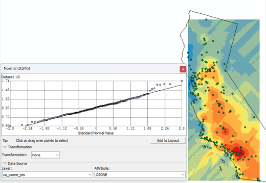 在同样的位置,选择【Normal QQPlot】,就得到了QQ图。如下,可以看出臭氧数据十分接近于一条直线,只在高值处出现部分偏差,与Hisgram工具得到的结果具有一致性,具有正态分布特征。