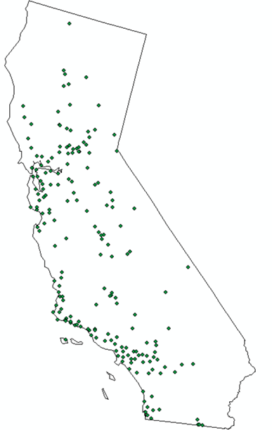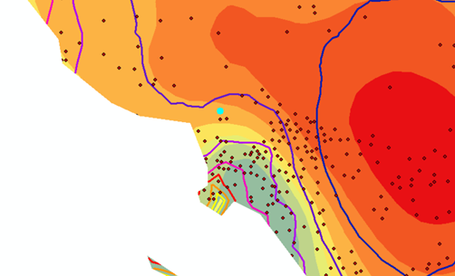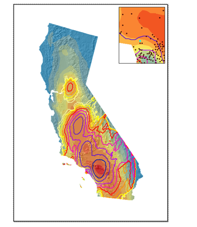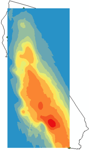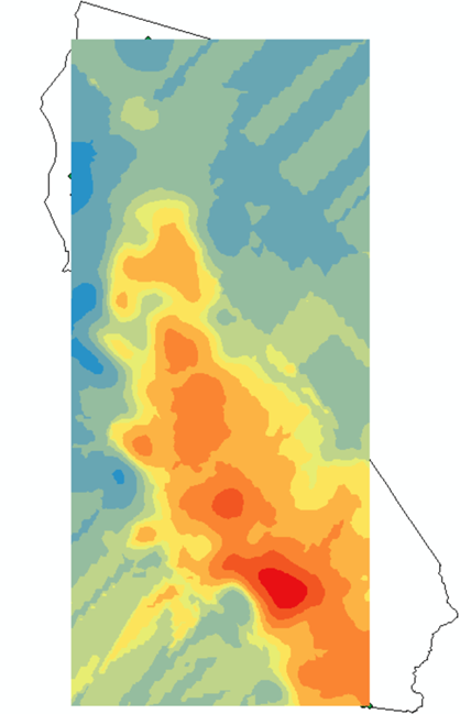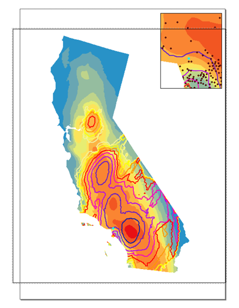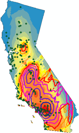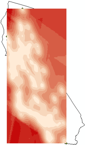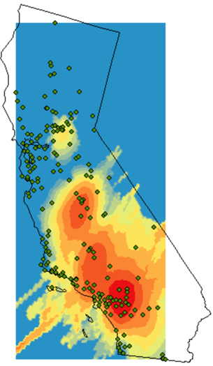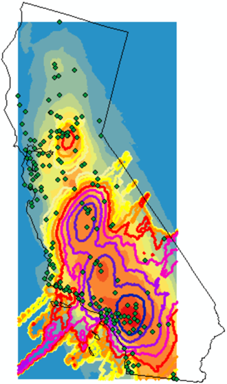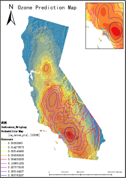 美国环保局负责对加利佛尼亚州的大气臭氧浓度进行监测。臭氧浓度值是通过遍布全州的监测站来测定的。已经知道所有监测站的臭氧浓度值,但是我们还想知道加利佛尼亚州其它任一地方的臭氧浓度值,但是考虑到费用以及实用性问题, 我们不可能在任何地方都建立监测站。地统计分析模块提供了许多工具,通过检测所有采样点之间的关系,生成一个关于臭氧浓度值、预测标准差(不确定性)以及超出临界值的概率的连续表面,从而使对其它点的浓度值进行最佳预测成为可能。