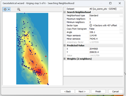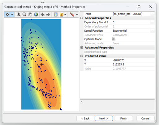 执行【Geostatistical Analyst->Geostatistical Wizard】进入地统计向导,然后按照指导流程进行设置,以臭氧点数据为输入,利用普通克里格插值法,得到未知点的臭氧浓度值。主要结果如下。