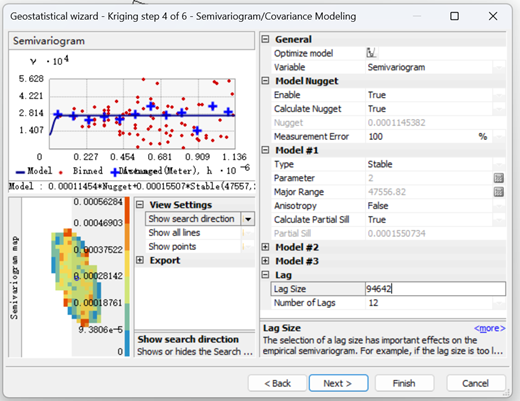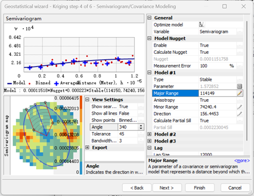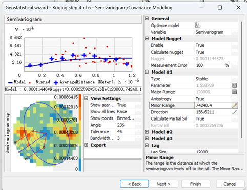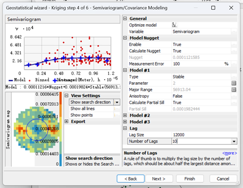 这里步长很大,更改步长为12000,设定步长组为10,得到新的缺省球面模型结果如下。可以看出,拟合得到的半变异函数图先上升后变平,即说明在超出自相关阈值后,自相关关系也就不再存在了。