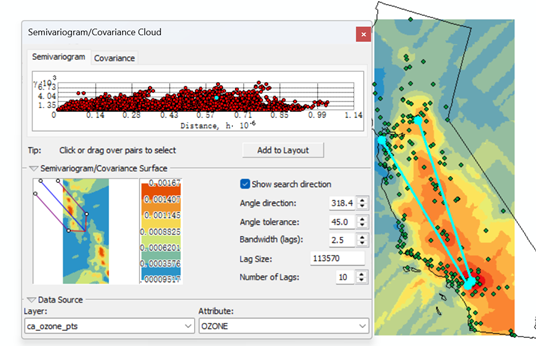然后再来看方向。勾选Show search direction,按如下调整。可以看出,洛杉矶向内陆其他地区的点对间,也有很高的半变异函数值。