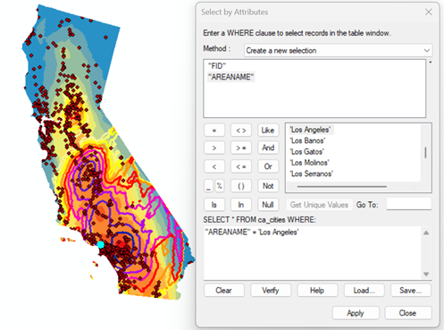 在ca_cities的属性表中按属性选择,定位到洛杉矶。