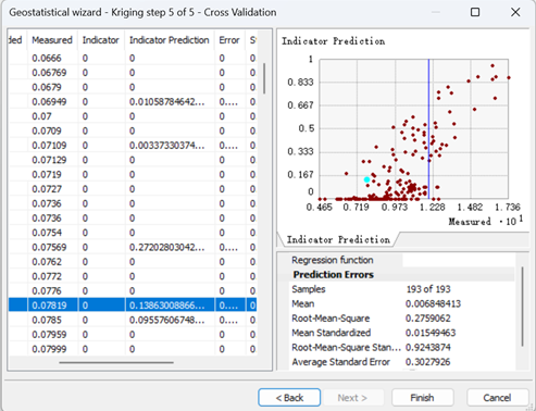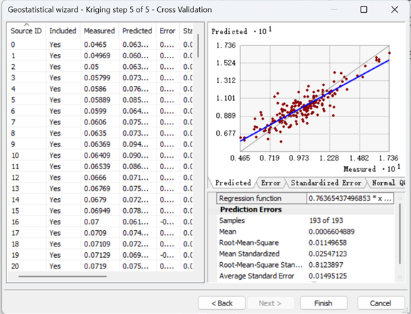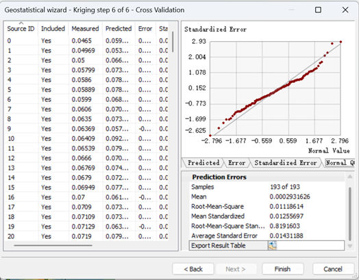 点击Next进入到交叉验证窗口。从QQ图可以看出,某些值稍微落在直线的上部,而某些值则稍稍落在直线的下部,但是大部分点都接近于一条平直的虚线,这表明预测误差近似于正态分布。
