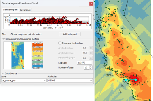 利用【Semivariogram/Covariance Cloud】工具,得到数据的半变异函数图如下。从高亮部分可以看出,该点在距离上很近但是变异值很高,可以看出从洛杉矶到海边,臭氧浓度的差异是很大的。
