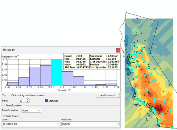 利用Histogram工具来直观的反映数据的分布情况。执行【Geostatistical Analyst->Export Data->Histogram】,在弹出的对话框按要求设置,在此给出ozone的分布结果。可以看出,数据单峰分布,也有一定的对称性。