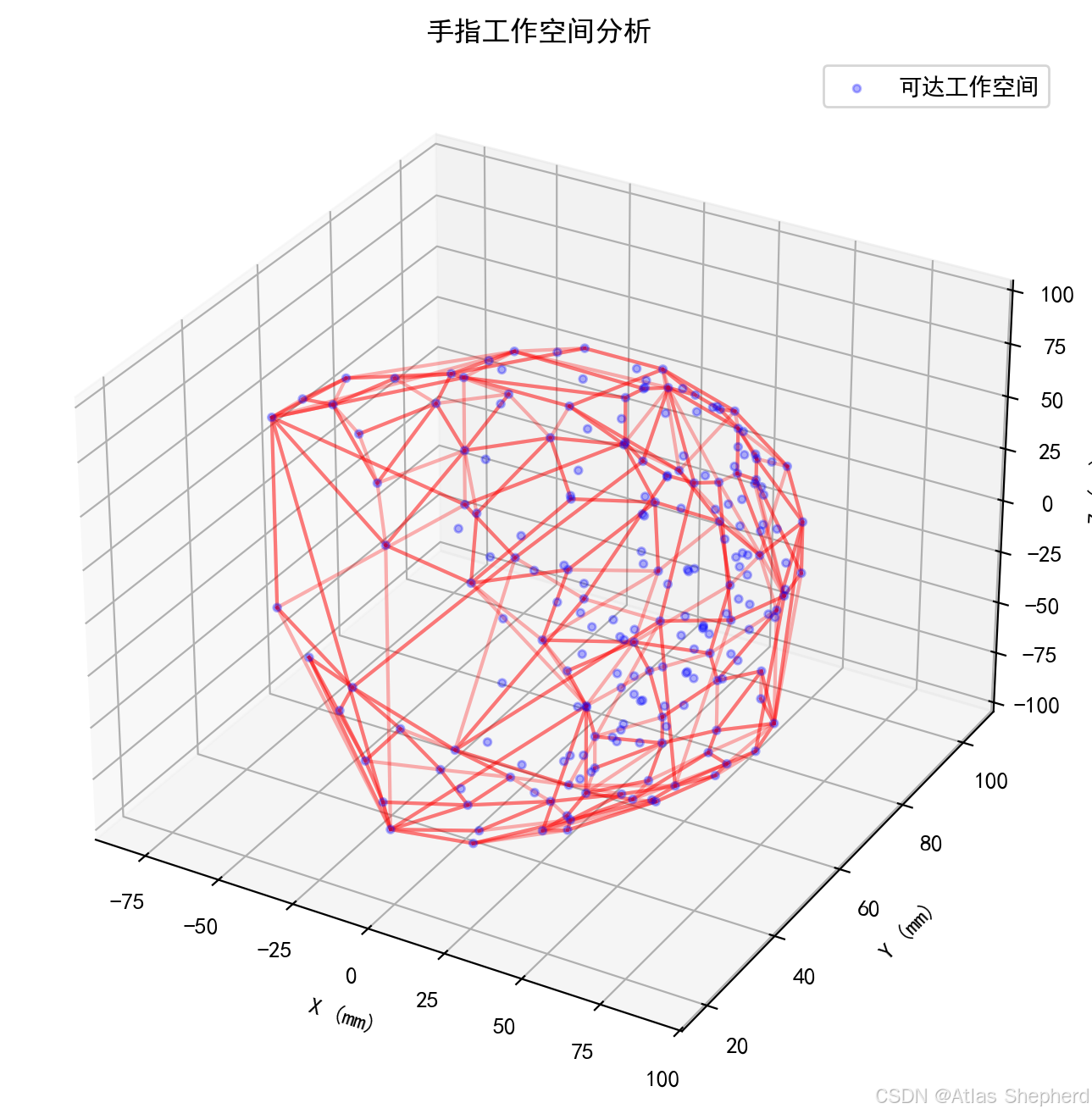 def calculate_workspace(self, resolution=10):# 通过离散化关节空间来计算可达工作空间# 使用凸包算法分析工作空间边界