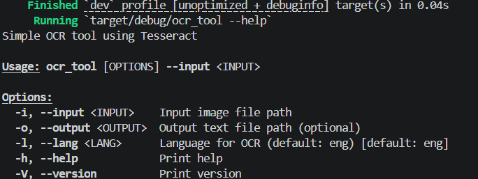 struct Args {/// Input image file path#[clap(short, long)]input: PathBuf,/// Output text file path (optional)#[clap(short, long)]output: Option<PathBuf>,/// Language forOCR(default: eng)#[clap(short, long, default_value = "eng")]lang: String,
