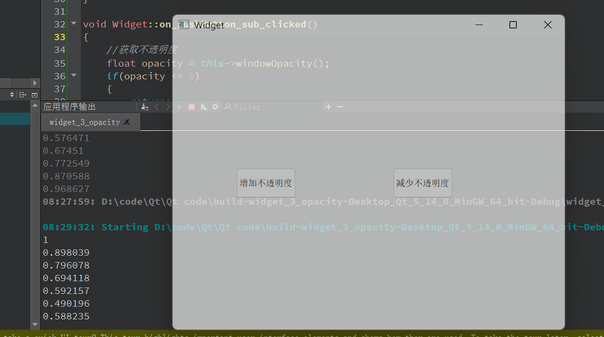 {//获取不透明度float opacity = this->windowOpacity();if(opacity <= 0){return;}qDebug() << opacity;opacity -= 0.1;setWindowOpacity(opacity);