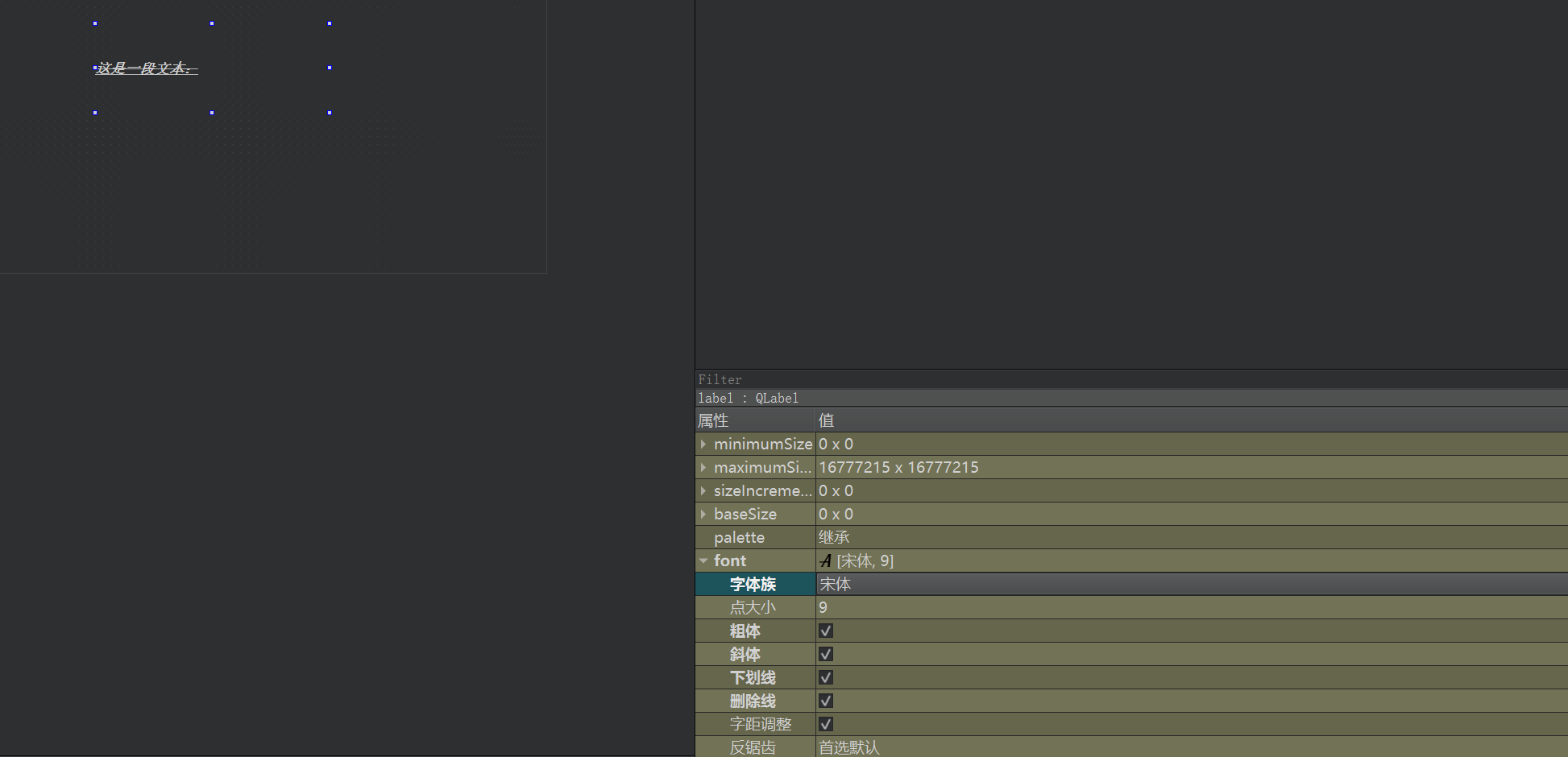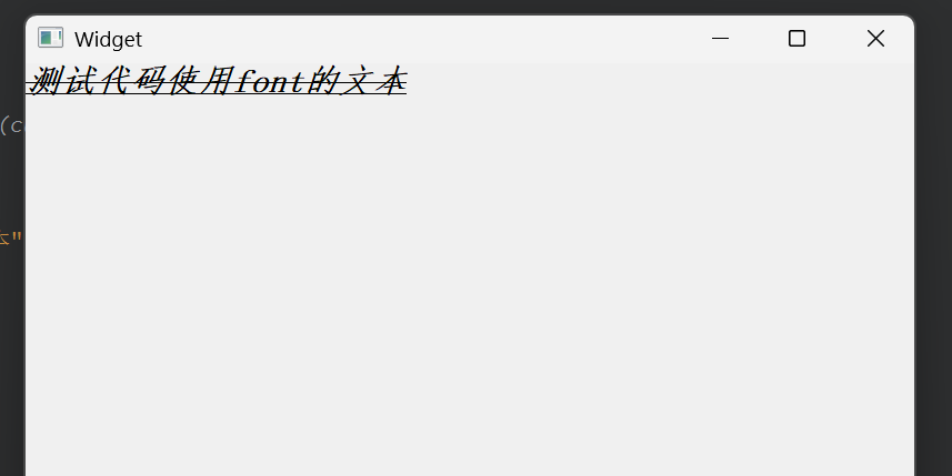 {ui->setupUi(this);QLabel* label = new QLabel(this);label->setText("测试代码使用font的文本");//创建字体对象QFont font;font.setFamily("仿宋");font.setPixelSize(30);font.setBold(true);font.setItalic(true);font.setUnderline(true);font.setStrikeOut(true);//把font对象设置到label中label->setFont(font);