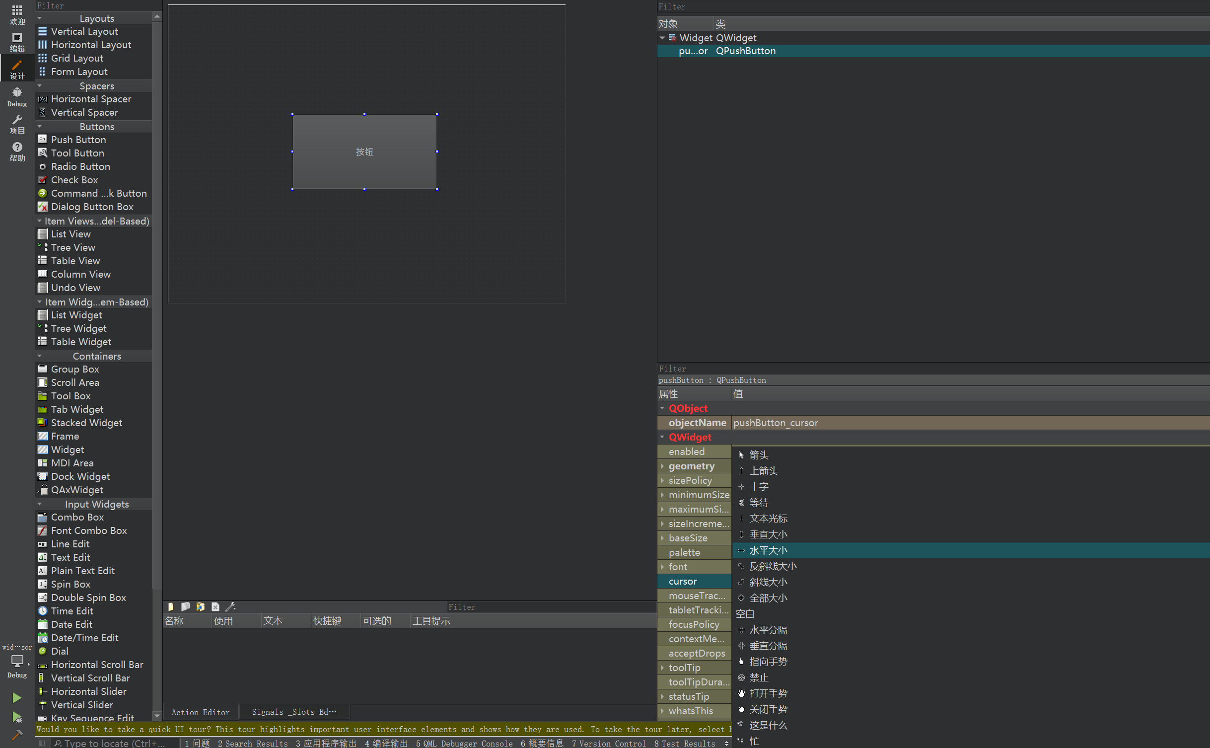 {ui->setupUi(this);QCursor cursor(Qt::WaitCursor);//等待状态的鼠标ui->pushButton_cursor->setCursor(cursor);