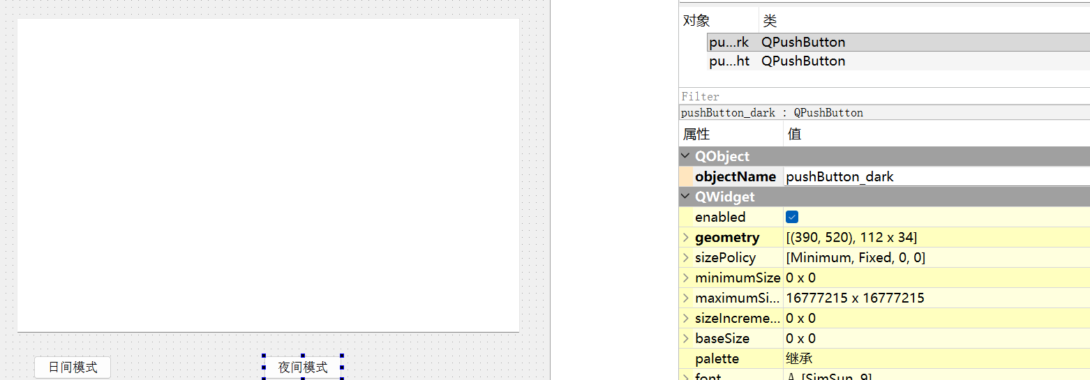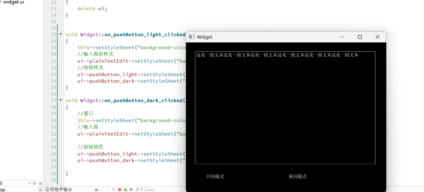{//窗口this->setStyleSheet("background-color:black;");//输入框ui->plainTextEdit->setStyleSheet("background-color:black;color:white;");//按钮颜色ui->pushButton_light->setStyleSheet("color:white;");ui->pushButton_dark->setStyleSheet("color:white;");}千万注意这里的单词拼写:如果拼写出错,不会有任何报错但是样式会不生效。