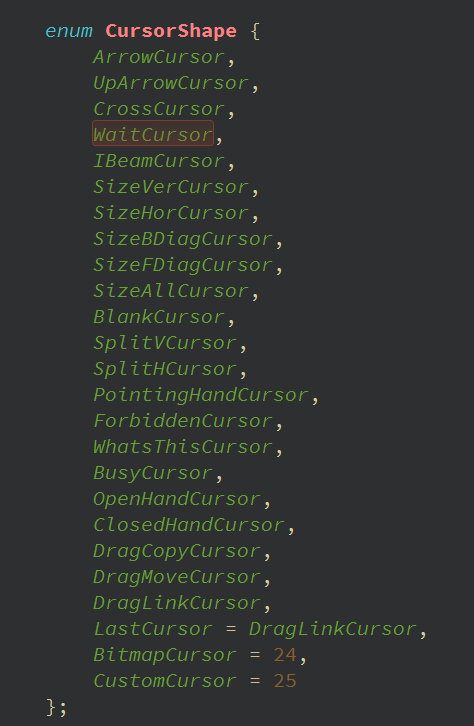 Ctrl + 左键点击Qt::WaitCursor 跳转到源码即可看到:系统内置的光标形状