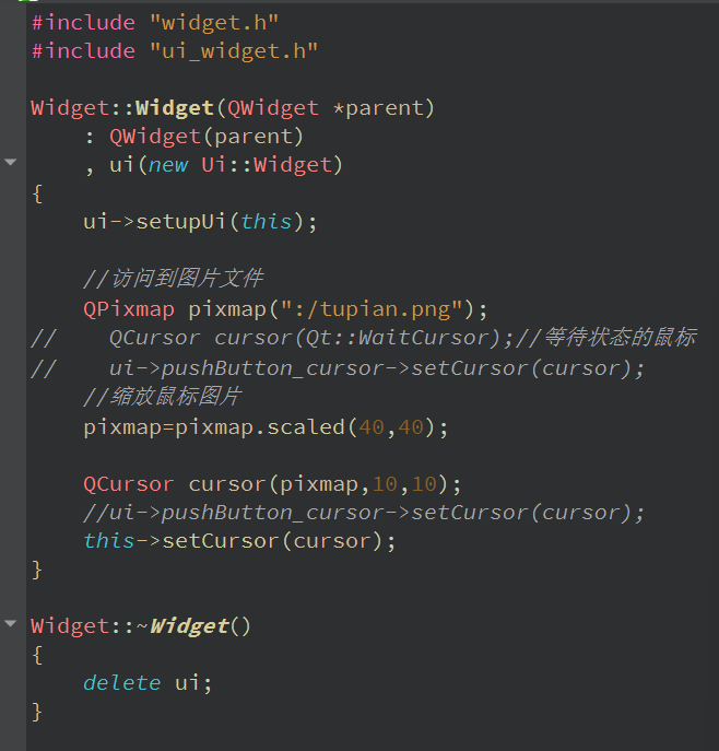 {ui->setupUi(this);//访问到图片文件QPixmap pixmap(":/tupian.png");QCursor cursor(pixmap);ui->pushButton_cursor->setCursor(cursor);