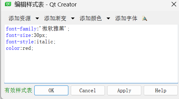 界面上创建一个label,然后label右下角属性栏找到styleSheet