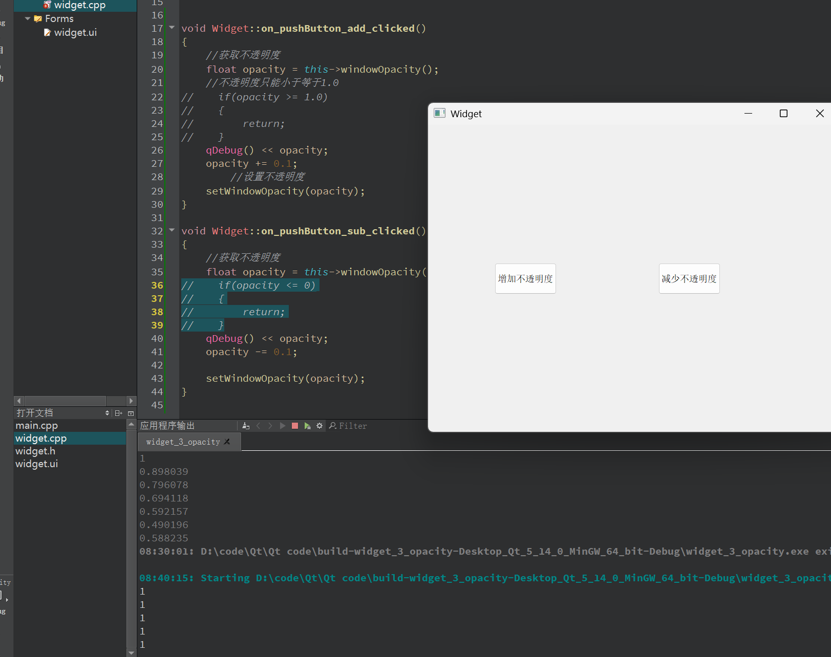 {//获取不透明度float opacity = this->windowOpacity();//不透明度只能小于等于1.0if(opacity >= 1.0){return;}qDebug() << opacity;opacity += 0.1;//设置不透明度setWindowOpacity(opacity);
