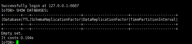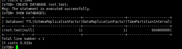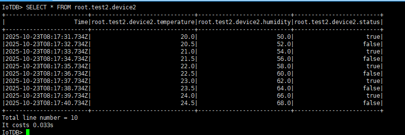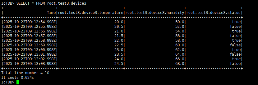 基于上一步,连接成功后,你会看到IoTDB的命令行界面。可以尝试执行以下SQL命令: