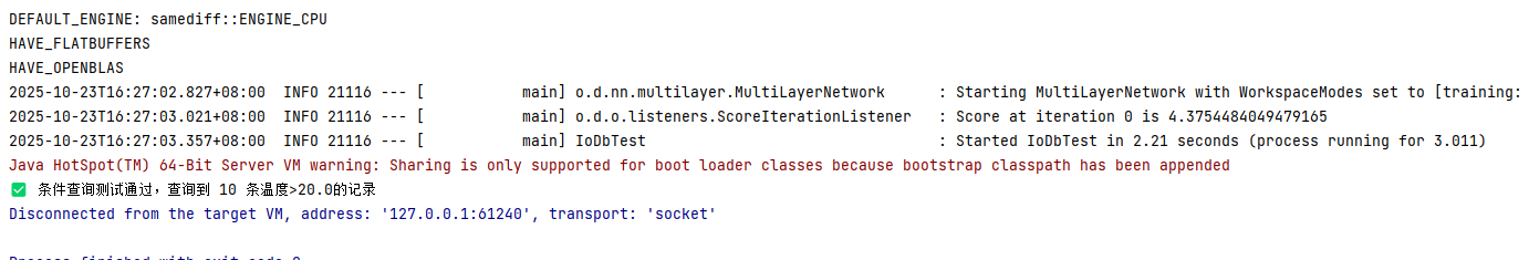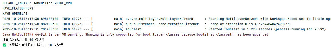 public class IoDbTest {private static final String TEST_STORAGE_GROUP = "root.test2";private static final String TEST_DEVICE = "device2";@Resourceprivate IotDBService iotDBService;@Test@DisplayName("测试数据库连接")void testConnection() {iotDBService.checkConnection();System.out.println("✅ 数据库连接测试通过");}@Test@DisplayName("测试创建存储组/数据库")void testCreateStorageGroup() {try {iotDBService.createStorageGroup(TEST_STORAGE_GROUP);System.out.println("✅ 存储组创建测试通过");} catch (Exception e) {System.out.println("❌ 创建存储组失败 : " + e.getMessage());}}@Test@DisplayName("测试创建时间序列")void testCreateTimeSeries() {try {iotDBService.createTimeSeries("root.test2.device2.temperature", TSDataType.FLOAT, TSEncoding.PLAIN);iotDBService.createTimeSeries("root.test2.device2.humidity", TSDataType.FLOAT, TSEncoding.PLAIN);iotDBService.createTimeSeries("root.test2.device2.status", TSDataType.BOOLEAN, TSEncoding.PLAIN);System.out.println("✅ 时间序列创建测试通过");} catch (Exception e) {System.out.println("❌ 创建时间序列失败 : " + e.getMessage());}}@Test@DisplayName("测试插入单条记录")void testInsertSingleRecord() {try {DeviceData data = new DeviceData(System.currentTimeMillis(),TEST_DEVICE,25.5,60.2,true);iotDBService.insertRecord(data);System.out.println("✅ 单条记录插入测试通过");} catch (Exception e) {System.out.println("❌ 插入单条记录失败 : " + e.getMessage());}}@Test@DisplayName("测试批量插入记录")void testBatchInsert() {try {List<DeviceData> dataList = new ArrayList<>();long baseTime = System.currentTimeMillis();for (int i = 0; i < 10; i++) {DeviceData data = new DeviceData(baseTime + (i * 1000), // 每秒一条数据TEST_DEVICE,20.0 + i * 0.5,50.0 + i * 2,i % 2 == 0);dataList.add(data);}iotDBService.insertRecords(dataList);System.out.println("✅ 批量插入测试通过,插入了 " + dataList.size() + " 条记录");} catch (Exception e) {System.out.println("❌ 批量插入失败 : " + e.getMessage());}}@Test@DisplayName("测试数据查询")void testDataQuery() {try {// 先插入一些测试数据DeviceData testData = new DeviceData(System.currentTimeMillis() - 5000,TEST_DEVICE,23.5,55.5,true);iotDBService.insertRecord(testData);// 查询数据String sql = "SELECT * FROM root.test.device1 WHERE time > " + (System.currentTimeMillis() - 10000);List<DeviceData> results = iotDBService.executeQuery(sql);System.out.println("✅ 数据查询测试通过,查询到 " + results.size() + " 条记录");results.forEach(data -> System.out.println(" - " + data));} catch (Exception e) {System.out.println("❌ 数据查询失败 : " + e.getMessage());}}@Test@DisplayName("测试条件查询")void testConditionalQuery() {try {String sql = "SELECT temperature, humidity FROM root.test.device1 WHERE temperature > 20.0";List<DeviceData> results = iotDBService.executeQuery(sql);System.out.println("✅ 条件查询测试通过,查询到 " + results.size() + " 条温度>20.0的记录");} catch (Exception e) {System.out.println("❌ 条件查询失败 : " + e.getMessage());}}}