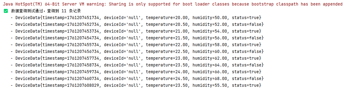 public class DeviceData {// 必须第一个字段是Time,存储时间戳:cite[10]private Long time;// 对应时间序列的字段,顺序需与SQL查询字段顺序一致private String deviceId;private Double temperature;private Double humidity;private Boolean status;// 全参构造器public DeviceData(Long time, String deviceId, Double temperature, Double humidity, Boolean status) {this.time = time;this.deviceId = deviceId;this.temperature = temperature;this.humidity = humidity;this.status = status;}// 无参构造器public DeviceData() {}