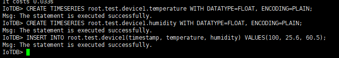 CREATE TIMESERIES root.test.device1.humidity WITH DATATYPE=FLOAT, ENCODING=PLAIN;-- 插入数据