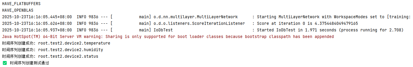 public class IotDBConfig {@Value("${spring.iotdb.ip}")private String ip;@Value("${spring.iotdb.port}")private int port;@Value("${spring.iotdb.user}")private String user;@Value("${spring.iotdb.password}")private String password;@Value("${spring.iotdb.fetch-size}")private int fetchSize;@Beanpublic Session iotSession() {Session session = new Session(ip, port, user, password, fetchSize);try {session.open(); // 打开连接} catch (IoTDBConnectionException e) {e.printStackTrace();}return session;}