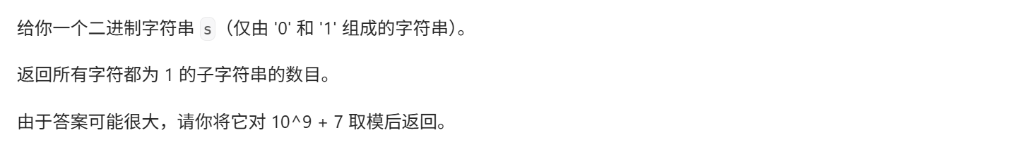 public:int numSub(string s) {int ret=0;int mod=1e9+7;long long count_one=0;for(int current=0;current!=s.size();current++){if(s[current]=='1') count_one++;else{ret+=(count_one*(count_one+1)/2)%mod;count_one=0;}}//处理最后一段ret+=(count_one*(count_one+1)/2)%mod;return ret;}