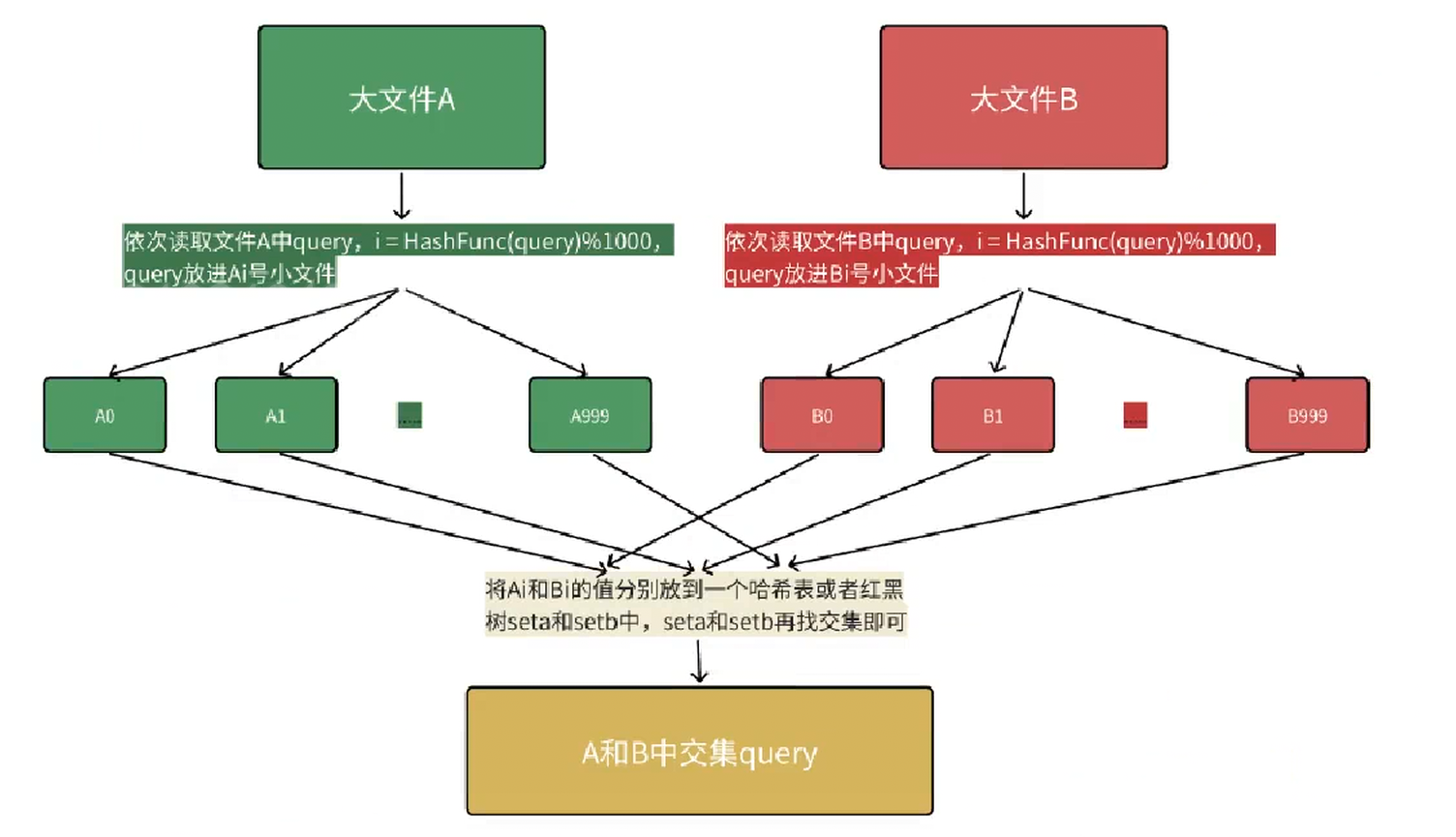 但是哈希切分也会有一个小问题,就是每个小文件不是均匀切分的,可能会导致某个小文件很大,内存放不下。而某个小文件很大有两种情况:1.这个小文件中大部分都是同一个query。 2.这个小文件是由很多不同的query构成的,本质是这些query冲突了。针对情况1,其实放到内存的set是可以放的下的,因为set能去重。针对情况2,需要换个哈希函数继续二次哈希切分。所以我们遇到大于1G的小文件,可以继续读到set中找交集。若set insert时抛出了异常(set插入数据抛异常只可能是申请内存失败了,不会有其他情况),那么说明内存放不下,是情况2,换个哈希函数进行二次哈希切分后再对应找交集。