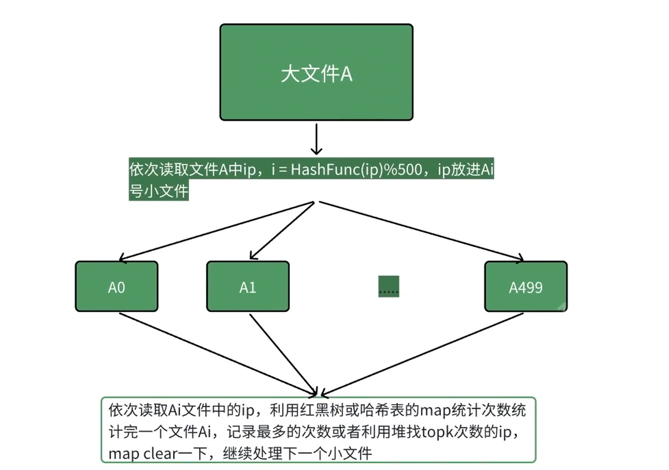 本题思路和上一题完全类似,依次读取文件A中的ip,i = HashFunc(ip) % 500,ip放进Ai号小文件,然后依次用map<string,int>对每个Ai小文件统计ip次数,同时求出现次数最多的ip或者topK的ip。本质是相同的ip在哈希切分的过程中,一定进入同一个小文件Ai,不可能出现同一个ip进入Ai和Aj的情况,所以对Ai进行统计次数就是准确的ip次数。