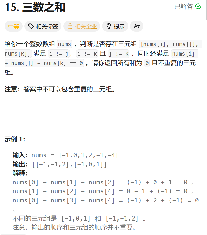 class Solution {public List<List<Integer>> threeSum(int[] nums) {List<List<Integer>> listall = new ArrayList<>();Arrays.sort(nums);for(int i = 0;i<nums.length;i++){if (i > 0 && nums[i] == nums[i - 1]) {continue;}int left = i+1;int right = nums.length-1;while(left<right&&left<nums.length&&right>i){int sum = nums[left] + nums[right]+nums[i];if(sum>0){right--;}else if(sum<0){left++;}else{List<Integer> list1 = new ArrayList<>();list1.add(nums[left]);list1.add(nums[right]);list1.add(nums[i]);listall.add(list1);while((left<right&&nums[right] == nums[right-1])){right--;}while((left<right&&nums[left] == nums[left+1])){left++;}right--;left++;}}}return listall;}