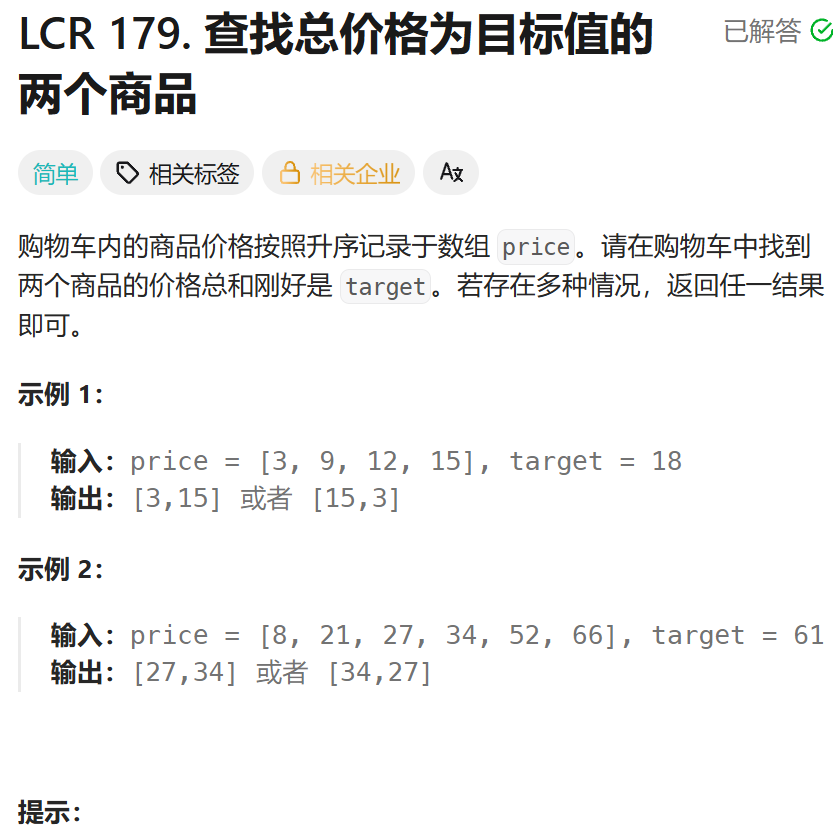 class Solution {public int[] twoSum(int[] price, int target) {int left = 0, right = price.length-1;while(left<right){int sum = price[left]+price[right];if(sum>target){right--;}else if(sum<target){left++;}else{return new int[] {price[left],price[right]};}}return new int[]{0};}